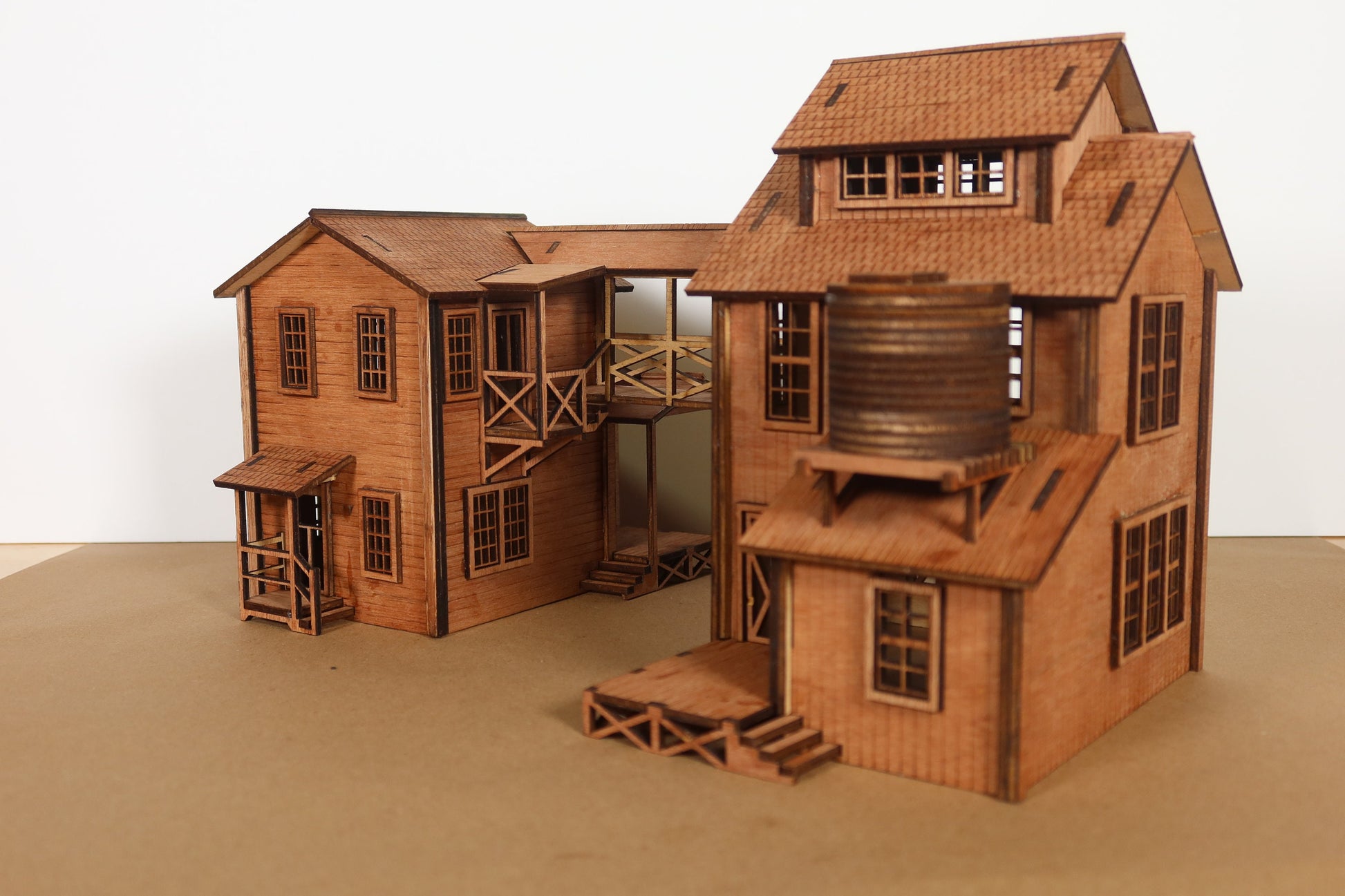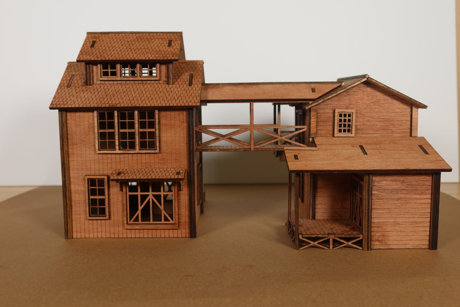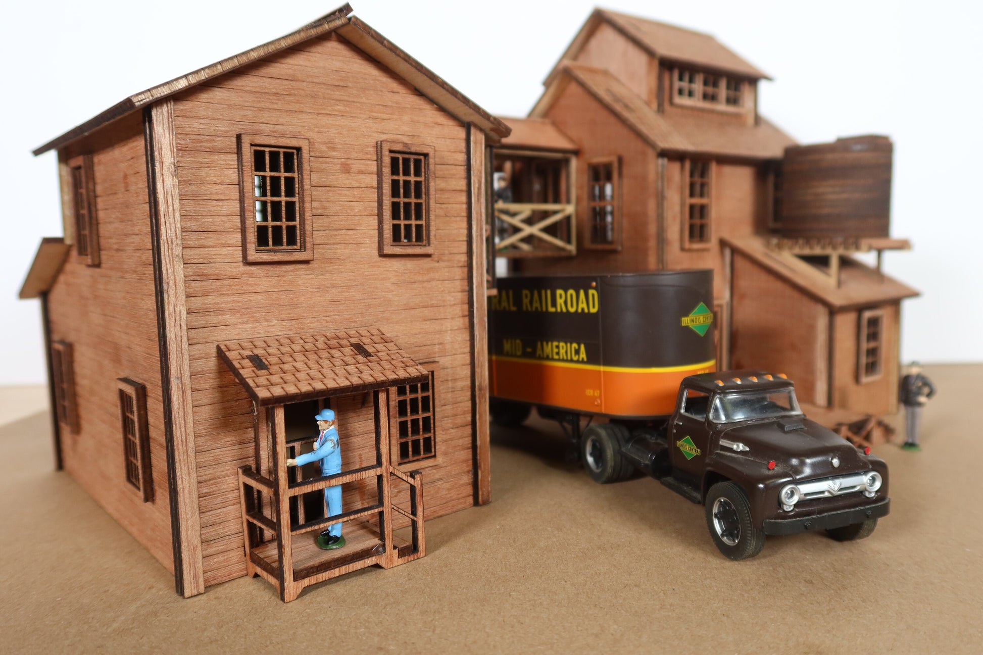 | A classic O-Scale tool and die shop, these would be appropriate from the early 1800s to the early 1950s. Tool and die shops specialized in small-small manufacturing, making tools and dies out of steel. This specific one allows a road to run through the middle, allowing one to stage trucks as the tool and die unloads or loads them. Also suitable for 1:48 dioramas, school projects, and presentations. 14 1/4in long x 9 3/4 in wide x 8 1/2 in tall when assembled. Trucks and figures are not included and are for display and scale only. |