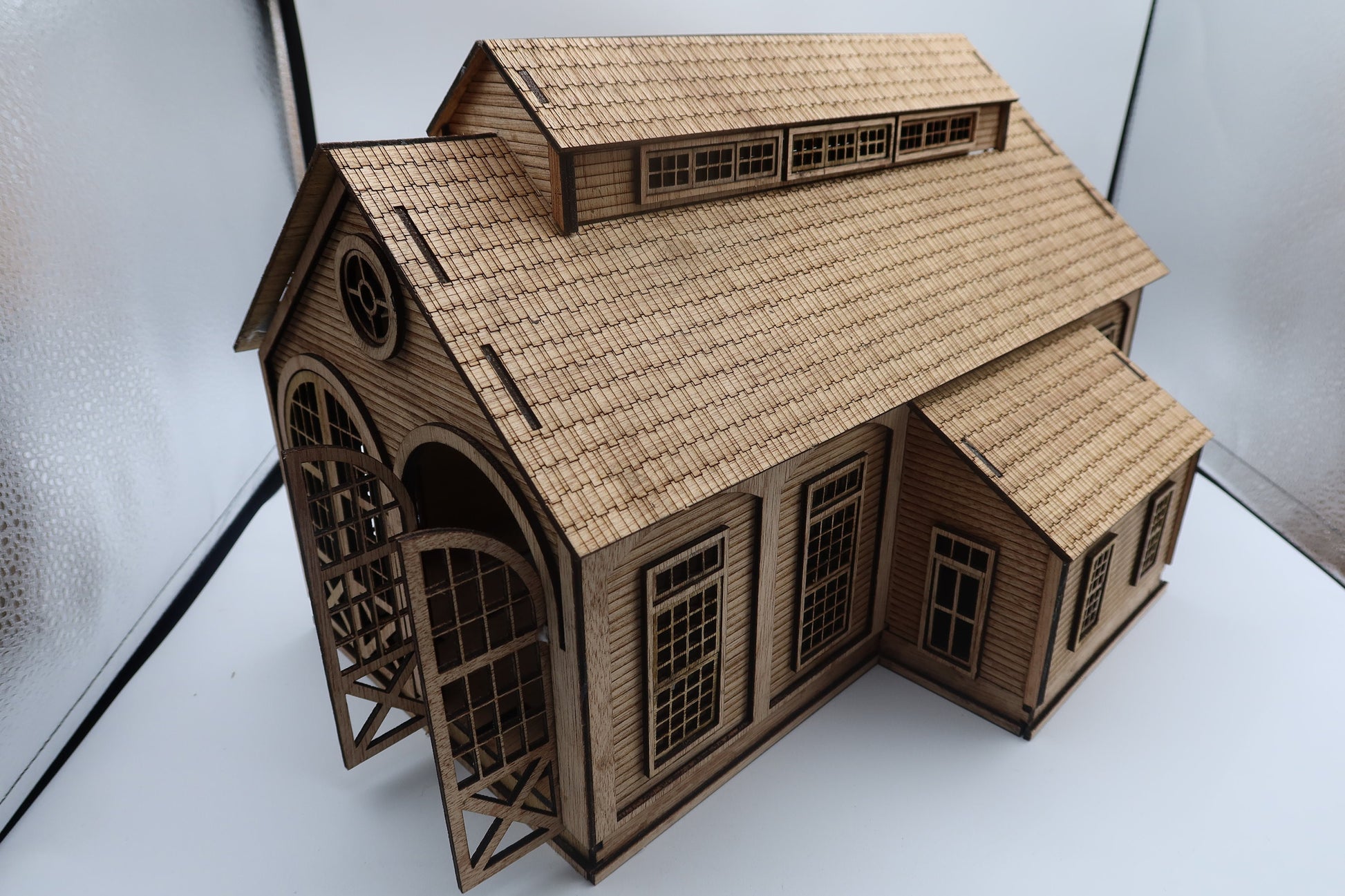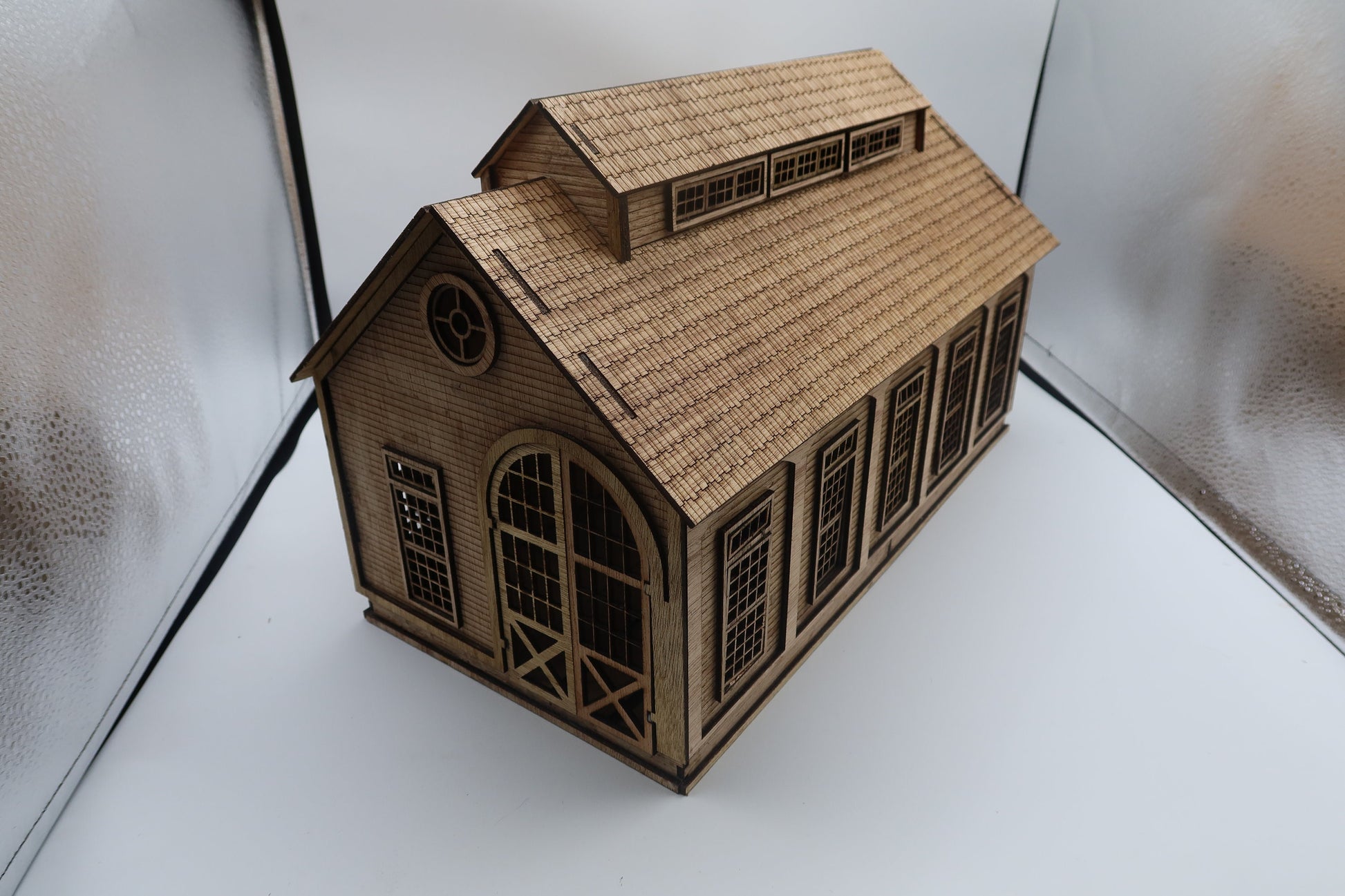 A large 1:48 scale building, well suited to be a locomotive shed or workshop, a heavy equipment maintenance building, a warehouse, or a fire station. It has two stalls for locomotives or equipment, with a run-through stall allowing it to function as a repair shop. It can comfortably store locomotives, cars, trucks or anything that’d suit you needs. NOTE: if purchased assembled. the doors will arrive OFF for you to glue in how you want. Locomotive and track not included, in the picture for scale/demonstration only."