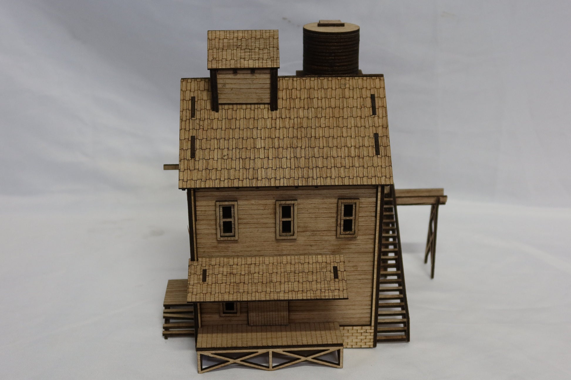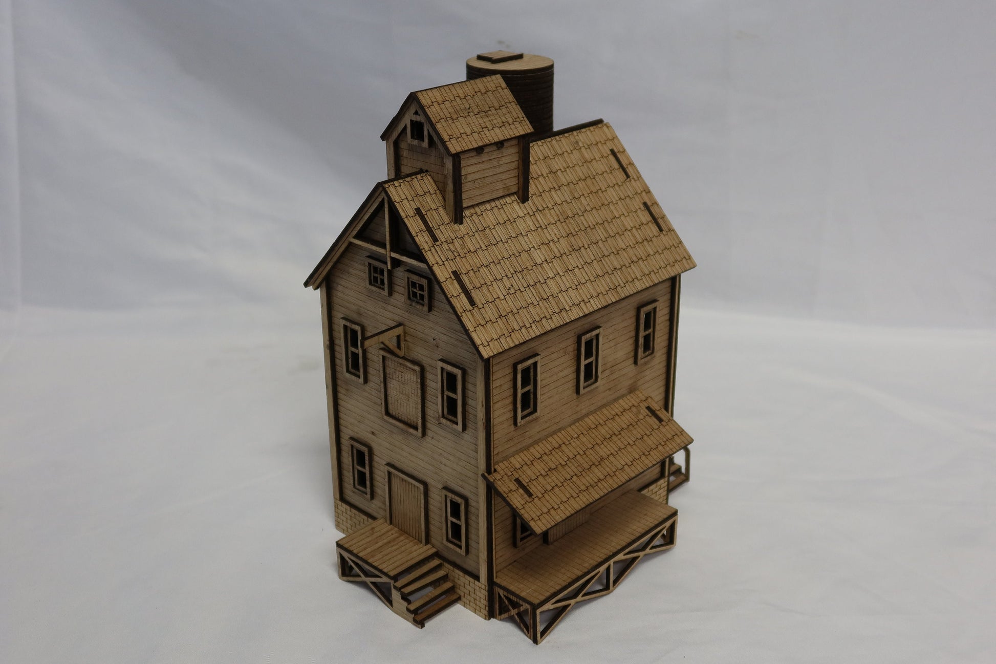 A classic O-Scale water mill would be appropriate from the early 1800s to the early 1900s when the advent of wide-scale electrical distribution made these obsolete. These were stationed along rivers, taking advantage of the flow of water to power machinery inside the building, to grind grains into flours, for metal-working, rolling out paper, or any other number of industrial processes. Also suitable for 1:48 dioramas, school projects, and presentations.